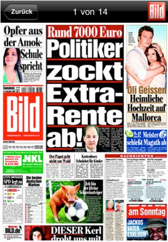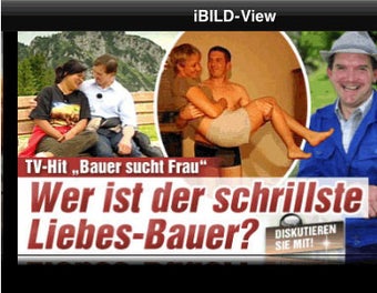 Bei Bedarf betrachtet man mit der BILD iPhone-App die Tageszeitung im PDF-Format. Umgeblättert wird mit dem iPhone-typischen Fingerschnipp, dazu erklingt das Geräusch von raschelndem Zeitungspapier. Die Nachrichten liest man wahlweise im Hoch- oder Querformat.